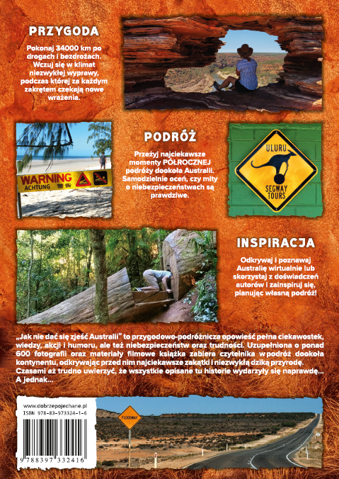 Książka przygodowo-podróżnicza, która zabiera w sześciomiesięczną podróż dookoła Australii. Masa ciekawostek i wiedzy, spotkań z dziką przyrodą, wartkiej akcji, humorystycznych dialogów, niebezpieczeństw oraz trudności, napisana w lekki sposób zapewnia rozrywkę na długie godziny. Książkę uzupełniają liczne kolorowe fotografie, które przeniosą Cię prosto do Australii. W trasie liczącej ponad 34 tysiące kilometrów poznasz i zwiedzisz ten kontynent nie wychodząc z domu.