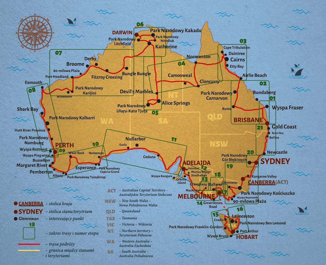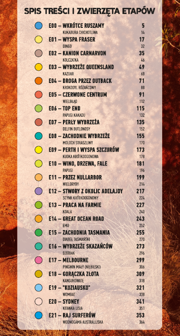 ZAWARTOŚĆ MERYTORYCZNĄ: Relacja jest szczegółowa, z zaznaczoną trasą na czytelnej mapie i głównymi przystankami. Najbardziej intrygujące fakty są wyróżnione w kolorowych ramkach, a zwierzęta australijskie mają swoje mini rozdziały, w których zawarto ich ciekawy opis i zdjęcia.